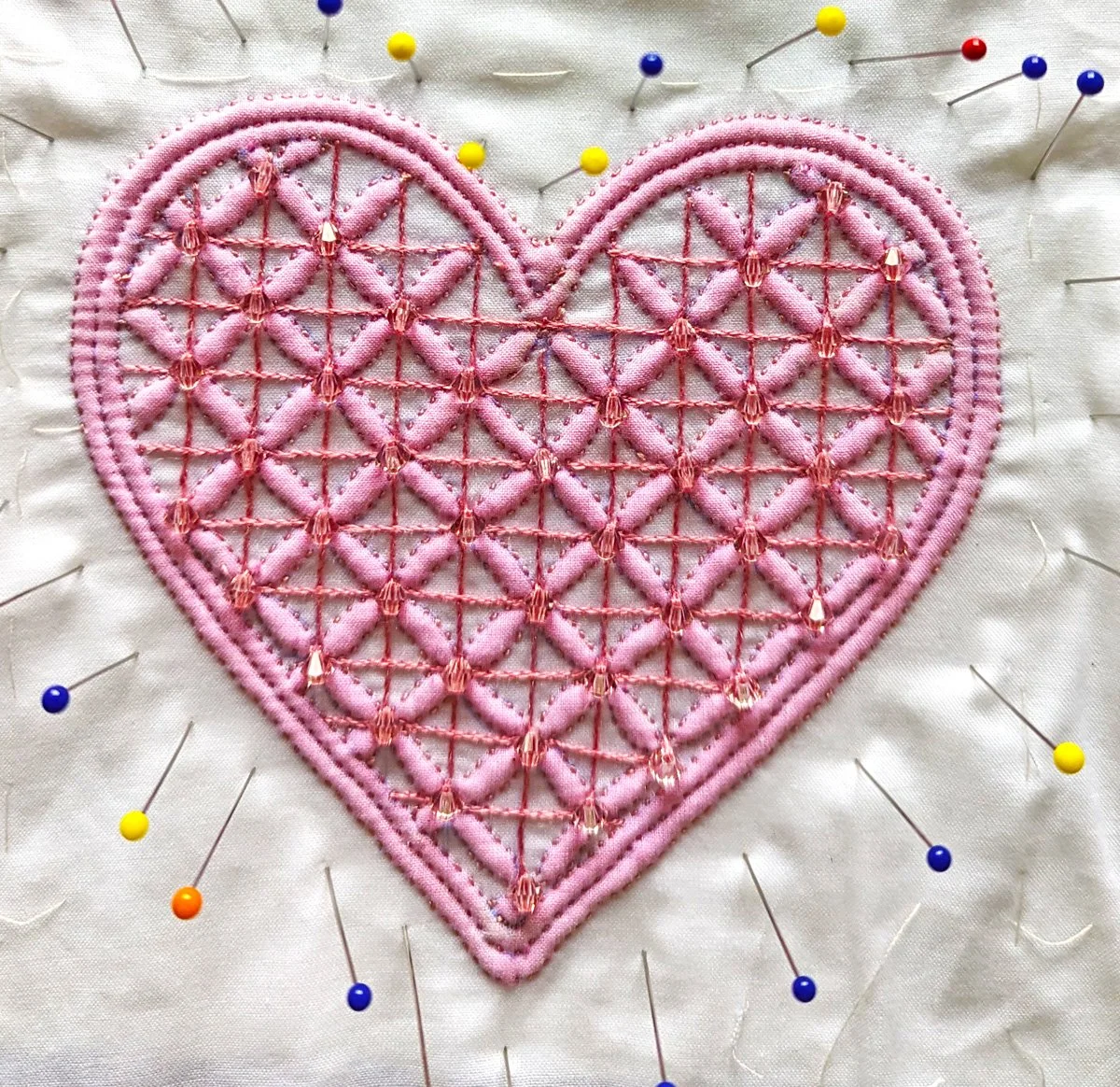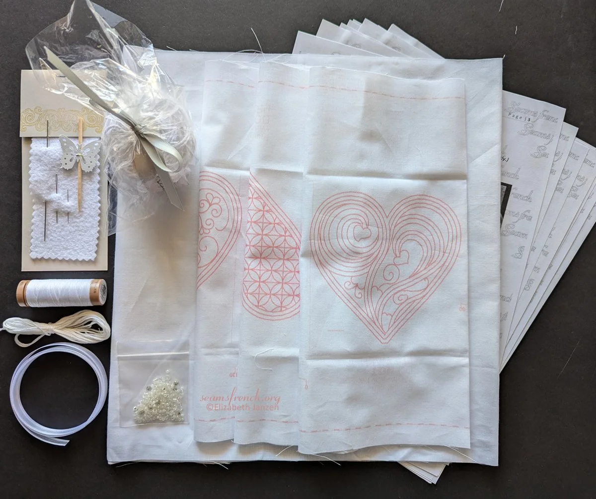 For those who don’t have access to boutis specific materials, you will have the option to purchase a kit which comes complete with the pattern, pre-printed onto the batiste, a printed manual and all boutis specific materials required to complete the project. Most additional tools and notions required will be familiar and very likely already in your sewing kit or easily available. A limited number of the Heart kits are available in my Etsy shop